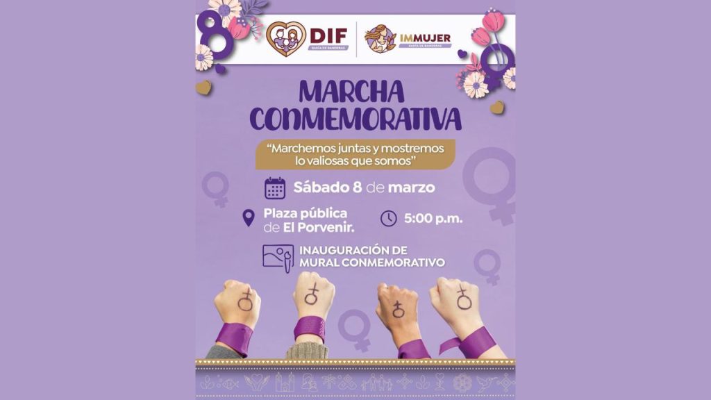 Bajo el lema “Marchemos todas y juntas, demostremos lo valiosas que somos”, la concentración se llevará a cabo el sábado 8 de marzo, a partir de las 5:00 p.m. en la Plaza Pública de El Porvenir para partir a las inmediaciones del Fracc Palma Real en San Vicente a la develación de un mural representativo