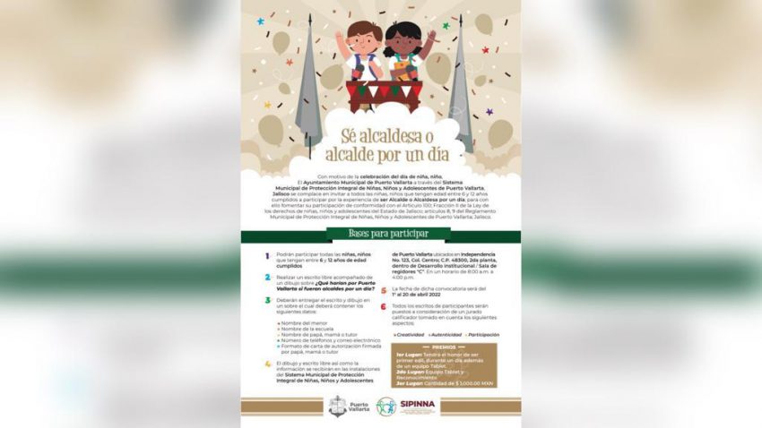 El Ayuntamiento de Puerto Vallarta, a través del Sistema Municipal de Protección Integral de Niñas, Niños y Adolescentes (SIPINNA), publicó la convocatoria para que en el marco del ‘Día del Niño’ los pequeños y pequeñas de 6 a 12 años de edad, participen en la experiencia ‘Sé alcaldesa o alcalde por un día’.