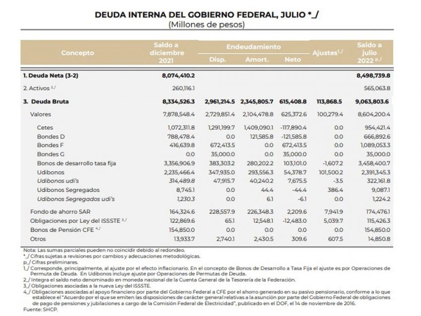 La SHCP señaló que con cifras de julio de 2022, la deuda neta del gobierno federal se ubicó en 10 billones 801.1 mil millones de pesos, de la cual 78.7% se encuentra denominada en moneda nacional y el 74.3% de los valores gubernamentales están a tasa fija y a largo plazo.