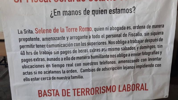 GUADALAJARA, Jal.(apro).- Personal de la Fiscalía de Jalisco acusó mediante lonas, que fueron colgadas en diferentes puntos de la ciudad, que viven terrorismo y abuso laboral.
