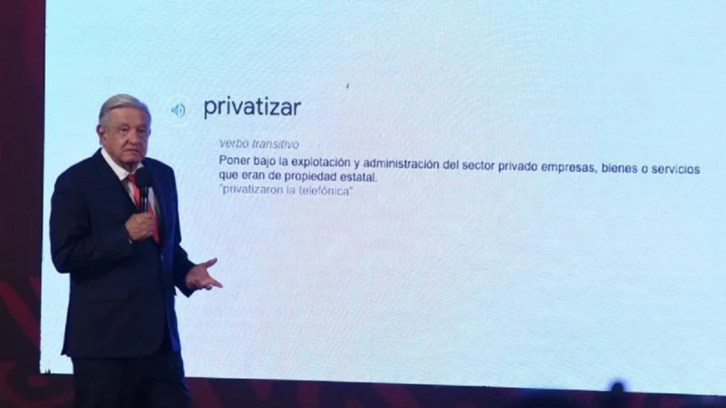 El mandatario federal pidió poner en la pantalla del Salón Tesorería lo que significa la palabra privatizar: “Esto para los jóvenes, que son los que más nos importan: ‘Poner bajo la explotación y administración del sector privado empresas, bienes o servicios que eran de propiedad estatal’, es pública; convertir lo público en privado, eso es privatizar”.