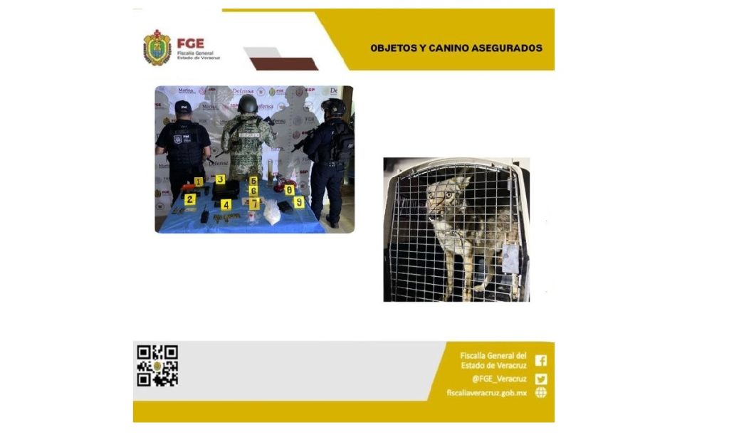 Asimismo, el 1 de marzo del año en curso, la FGE informó sobre el aseguramiento de un espécimen de coyote y otros animales durante un cateo realizado en el municipio de Córdoba, donde también se halló una sustancia granulada color blanco, cartuchos balísticos de distintos calibres, una identificación, un teléfono celular, un radio, un estuche para arma corta, un inhalador para droga y porta cargadores.