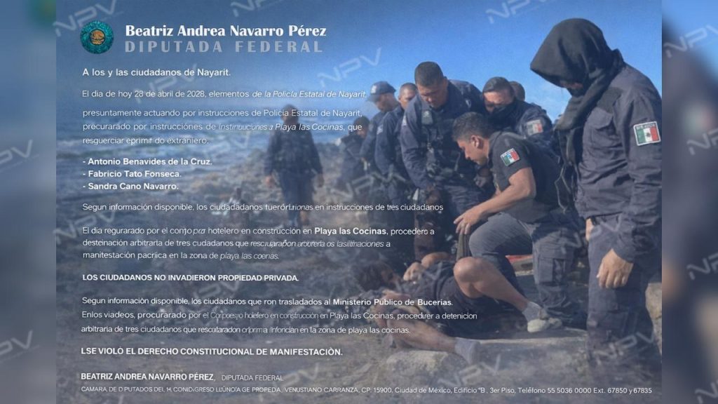 La tensión en la costa de Bahía de Banderas escaló este martes cuando elementos de la Policía Estatal de Nayarit privaron de la libertad a tres personas que se manifestaban pacíficamente en la zona de Playa «Las Cocinas», en Punta de Mita. Los ciudadanos Antonio Benavides de la Cruz, Fabricio Yáñez Fonseca y Sandra Cano Navarro fueron retirados por la fuerza y trasladados a los separos de Bucerías bajo el argumento de resguardar el perímetro de una obra privada.