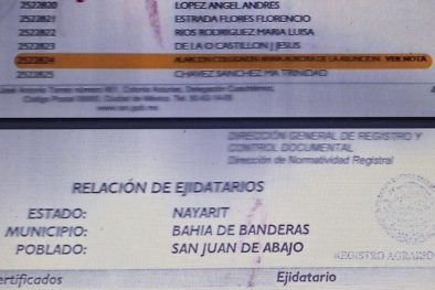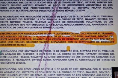 Y es que, en el Padrón del Ejido de San Juan de Abajo, Bahía de Banderas, Nayarit, de fecha 14 de diciembre 2017, se detecta el registro del nombre de una mujer que se acredita como ejidataria tres veces derivado de sentencias a su favor por parte del Tribunal Unitario Agrario 19 donde tres ejidatarios de este núcleo ejidal le vendieron sus derechos agrarios y el magistrado en turno resolvió que era procedente tales cesiones de derechos, pero, en el colmo de la corrupción imperante, es que dichas resoluciones las acordó el magistrado en la misma fecha; es decir, el 19 de febrero 2014.