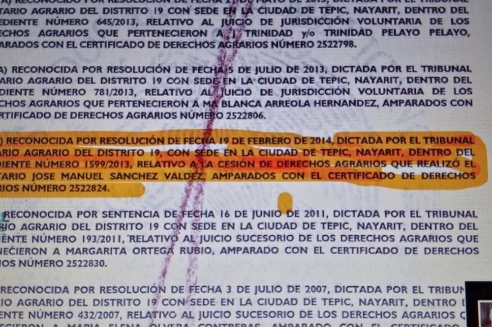 Y es que, en el Padrón del Ejido de San Juan de Abajo, Bahía de Banderas, Nayarit, de fecha 14 de diciembre 2017, se detecta el registro del nombre de una mujer que se acredita como ejidataria tres veces derivado de sentencias a su favor por parte del Tribunal Unitario Agrario 19 donde tres ejidatarios de este núcleo ejidal le vendieron sus derechos agrarios y el magistrado en turno resolvió que era procedente tales cesiones de derechos, pero, en el colmo de la corrupción imperante, es que dichas resoluciones las acordó el magistrado en la misma fecha; es decir, el 19 de febrero 2014.