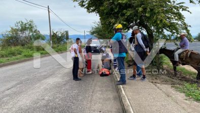 ?Dos jovencitas resultaron lesionadas tras derrapar en una motocicleta, cuando circulaban sobre la avenida de ingreso al fraccionamiento La Misión, en San Vicente, mismas que fueron auxiliadas por socorristas de la Cruz Roja, quienes les brindaron los primeros auxilios y las trasladaron a recibir atención médica a un hospital, tomando nota los agentes de Tránsito Municipal.(José Luis Preciado/NoticiasPV.Com).