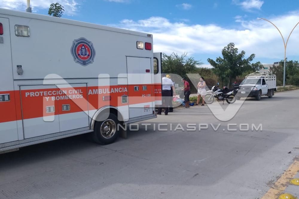 Vecinos de San Vicente, sufrieron lesiones de consideración al caer de la motocicleta en la que circulaban sobre la avenida de ingreso al edificio en construcción del nuevo IMSS en San Clemente de Lima, en Bahía de Banderas.