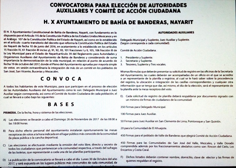 Un reporte ciudadano se recibió este medio de comunicación por parte de vecinos del poblado de Mezcalitos interesados en participar en la Elección de Autoridades Auxiliares y Comités de Acción Ciudadana en el sentido de que han estado esperando la publicación de dicha convocatoria, por lo que pensaron que había interés en que no se supiera para tomar ventaja otros grupos allegados al gobierno municipal, sin embargo, la convocatoria si se publicó en medios locales, pero en la página Web del X Ayuntamiento de Bahía de Banderas, que es donde buscaron tal publicación no existe.