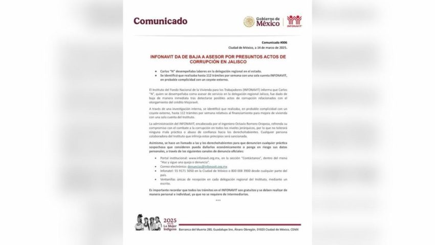 El Instituto del Fondo Nacional de la Vivienda para los Trabajadores (Infonavit) dio de baja a Carlos “N”, quien se desempeñaba como asesor de servicio en la delegación regional Jalisco, por presuntos actos de corrupción en el otorgamiento del crédito Mejoravit.