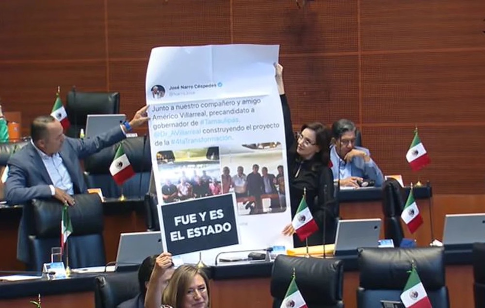 Sin embargo, momentos antes del inicio de las participaciones, destacaron la pancarta con la que la senadora Lilly Téllez (PAN) expuso el supuesto tweet que José Narro Céspedes había eliminado tras los señalamientos por aparecer junto a Américo Villarreal y El Gerry, presunto operador del Cártel del Golfo.