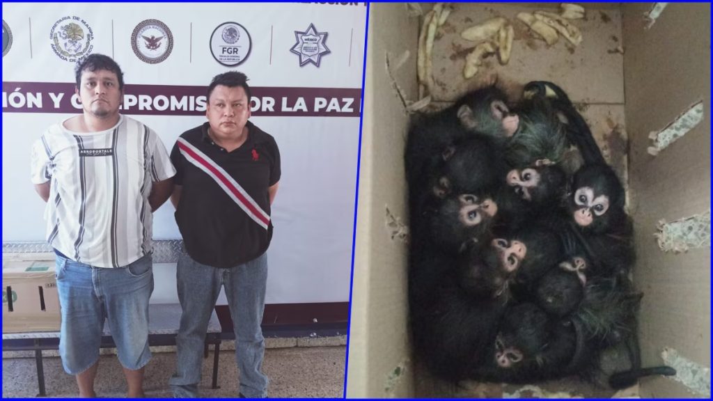 Autoridades de Tabasco detuvieron a dos hombres en Villahermosa tras una discusión vial que derivó en una persecución policiaca, en la que fueron sorprendidos transportando ilegalmente nueve crías de mono araña, especie catalogada como protegida en México.
