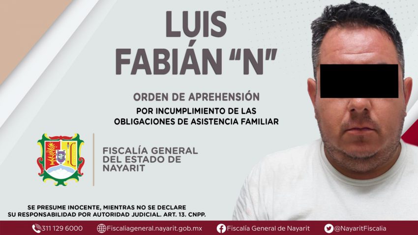 Comunicado.- La Fiscalía General de Nayarit a través de la Agencia de Investigación Criminal dio cumplimiento a una orden de aprehensión en el municipio de Bahía de Banderas contra Luis Fabián “N”, por su presunta participación en hechos que según apreciación de la ley encuadran el delito de incumplimiento de las obligaciones de asistencia familiar.