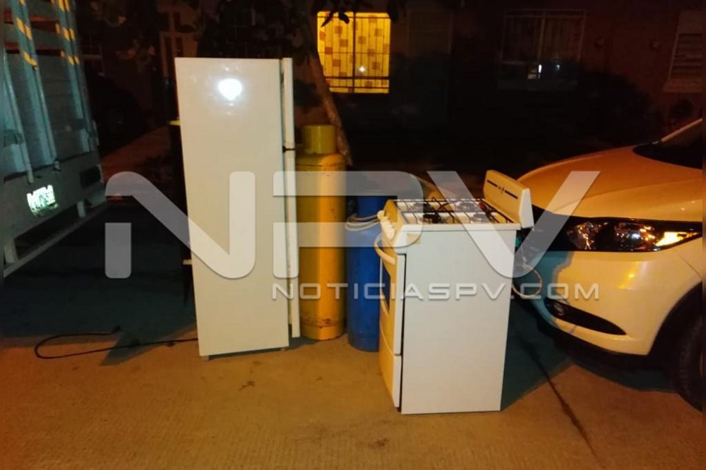El propietario de la vivienda fue notificado vía telefónica de lo que estaba sucediendo y este negó que haya mandado a los sujetos a sacar sus pertenencias, y que él no tenía ningún sobrino, por lo que los vecinos llamaron inmediatamente a los agentes policiacos, procediendo los dos hombres a bajar de una camioneta Nissan, estaquitas, color blanco, modelo 2017, con placas de circulación JV-21-503 del estado de Jalisco, un refrigerador marca IEM, una estufa IEM, un cilindro de gas amarillo de 30 kilos, otro de color azul, de 20 kilos, una comprensora marca Goni, una campana extractora para cocina, una bolsa jumbo llena de cobijas, un sartén verde con rojo, una bolsa color verde con herramientas, 3 Ollas de acero inoxidable, un cazo de acero inoxidable, un neumático de tráiler, y un paraguas playero.
