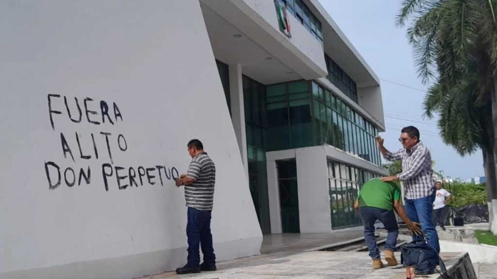 Campeche, Camp. Por pintar en el edificio del comité estatal del PRI la leyenda “Fuera Alito, don Perpetuo”, un militante priísta fue detenido por elementos de la Secretaría de Protección y Seguridad Ciudadana y remitido a la Fiscalía General del Estado, por el presunto delito de vandalismo.