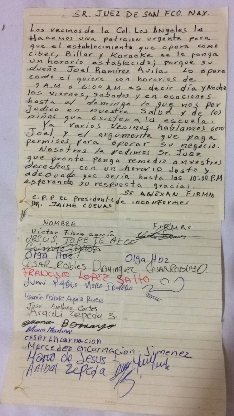 En tal escrito, los vecinos piden se regule a este negocio con horarios adecuados que les permita a sus familias descansar en paz los fines de semana. Cabe mencionar, que, avisada la autoridad, sin corroborar si efectivamente los vecinos tenían razón, de pronto, este fin de semana, el mismo día que se celebraría tal evento, el propietario lo canceló y quienes junto con este empresario habían organizado tal evento empezaron a culpar al delegado de tal cancelación.