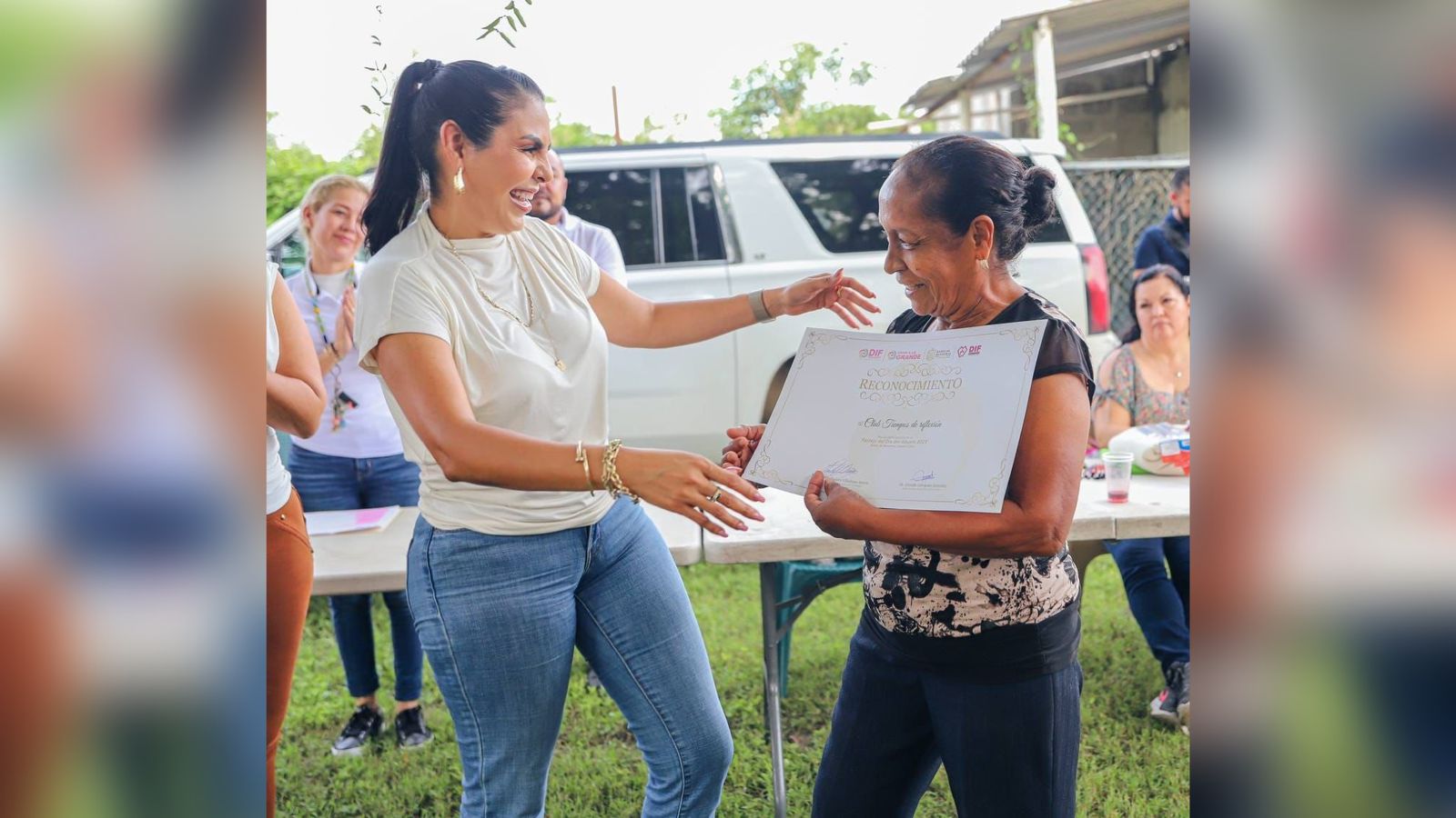 Durante la entrega de las despensas, la presidente municipal, Mirtha Villalvazo, se comprometió a poner un domo en la cancha de Tapachula, y a dejar la casa de la Tercera Edad de esta localidad como nueva.