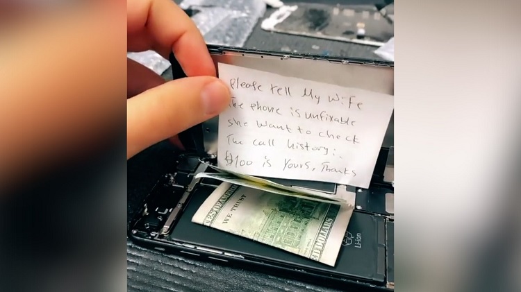 Según cuenta Warda, un cliente acudió a la tienda con su mujer y dejaron el iPhone del hombre para arreglar. Pero, al abrir la parte de atrás, el técnico no dio crédito al ver la nota que se encontraba dentro: «Por favor, dile a mi mujer que su teléfono no se puede reparar. Quiere revisar el historial de llamadas. Estos 100 dólares son para ti. Gracias”. Junto a la nota se encontraba, efectivamente, un billete.