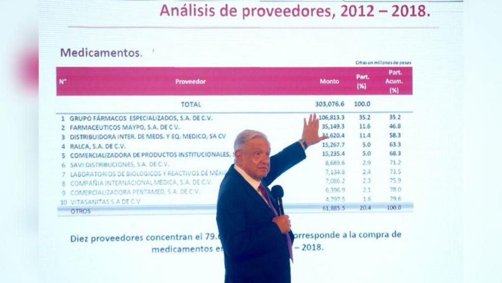 En respuesta a una pregunta, el mandatario planteó que, en el periodo 2012-2018, diez proveedores manejaban prácticamente 80 por ciento de la venta de medicamentos, de un total de más de 303 mil millones de pesos que el Estado mexicano destinaba a ese rubro.