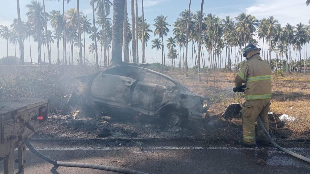 De acuerdo con el reporte recibido a través de la línea de emergencias 9-1-1, el vehículo tipo sedán terminó recargado sobre una palmera, comenzando a incendiarse debido al impacto. Bomberos de Nayarit, pertenecientes a la base regional de Acaponeta, acudieron rápidamente al lugar y extinguieron las llamas, logrando erradicar por completo el incendio.