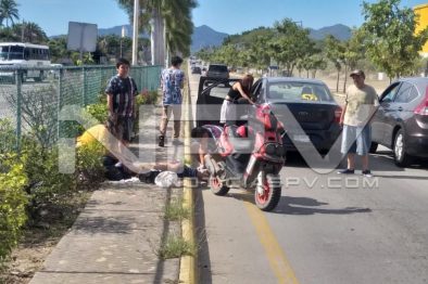 Motociclistas resultaron lesionados luego de chocar de frente y por alcance contra un auto, al circular en exceso de velocidad sobre el Boulevard Riviera Nayarit, quienes fueron auxiliados por un paramédico de un hospital particular, quien fue el que solicitó apoyo de una ambulancia para trasladar a uno de ellos a recibir atención médica a un hospital.