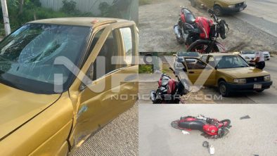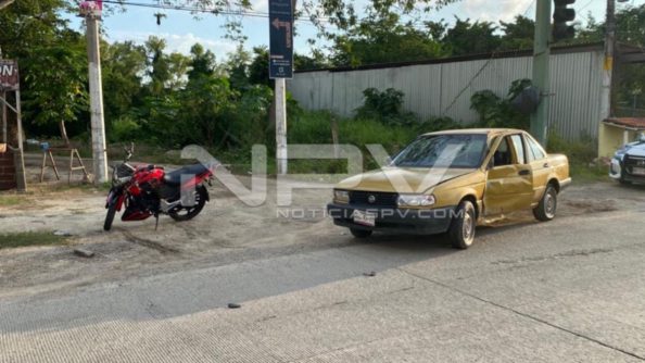 Hasta ese sitio se dirigieron los agentes de Tránsito a bordo de sus unidades radio patrullas, quienes al arribar se percatan del accidente, informando que se trata de una motocicleta Italika de color rojo con negro y un vehículo Tsuru, con placas de Nayarit, que chocaron al momento que el conductor de la moto rebasó por zona prohibida y se impactó contra el auto.