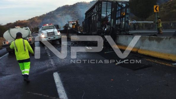 Los hechos ocurrieron en la autopista Tepic-Guadalajara a la altura del kilómetro 110, en donde se registró un incendio originado por un choque entre un trailer que transportaba jicamas y uno más con una cama baja que transportaba maquinaria.