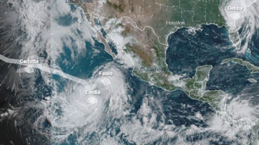 Hay cuatro meteoros que actualmente provocan efectos en el clima de México: Carlotta, Fabio, Emilia y Debby