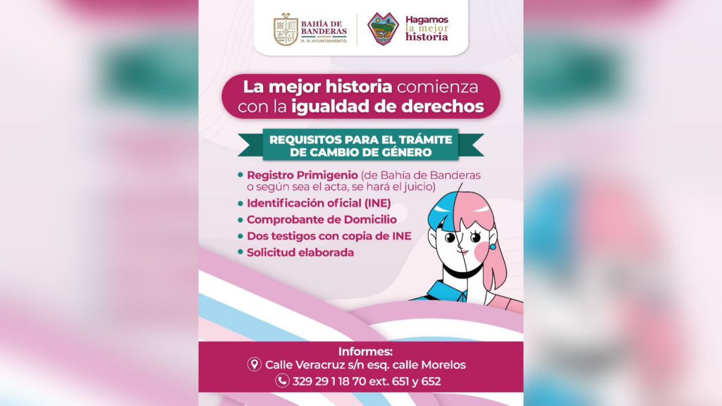 Bahía de Banderas Nayarit | 21 de marzo de 2023.- El Ayuntamiento de Bahía de Banderas, a través del Registro Civil, invitan a la población que desee cambiar de identidad de género, a llevar a cabo el trámite correspondiente.