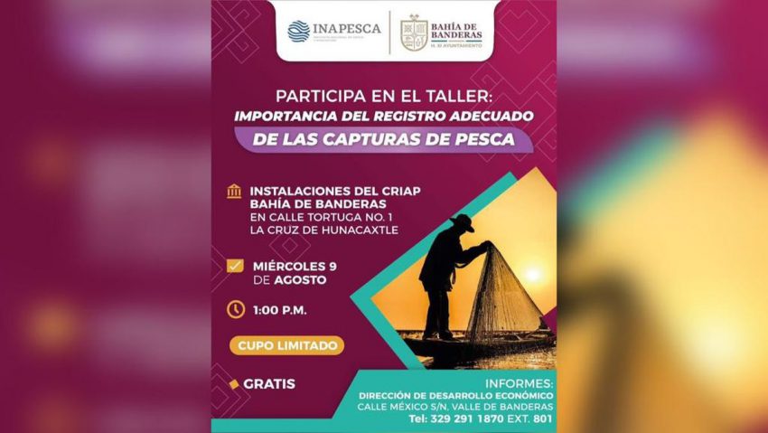 Bahía de Banderas Nay., 9 de agosto de 2023.- La Dirección de Desarrollo Económico, del gobierno municipal de Bahía de Banderas, en conjunto con el Instituto Nacional de Pesca (INAPESCA) llevará a cabo este jueves un taller sobre la Importancia del registro adecuado de las capturas de pesca.