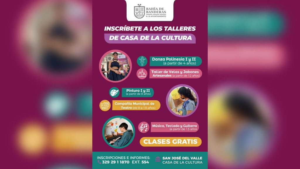 Todos los talleres son completamente gratuitos y se imparten en la Casa de la Cultura (antiguo velatorio) del Gobierno de Bahía de Banderas, ubicada en la localidad de San José, a excepción de Danza Polinesia, la cual también se imparte en el Jardín del Pulpo en La Cruz de Huanacaxtle. Para mayores informes e inscripciones, comunicarse al número telefónico 32929-11870 extensión 554.