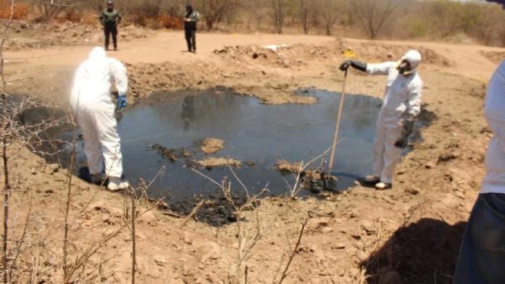 Son en total 13 losas en el complejo de fosas, cada una con capacidad de 3 mil 300 litros. En los cinco días de búsqueda han hallado restos humanos. Un camión “váctor” evacua el exceso de agua y lo drena sobre una planicie. Ahí, como gambusinos, dos hombres con un rastrillo buscan pedacitos de huesos.
