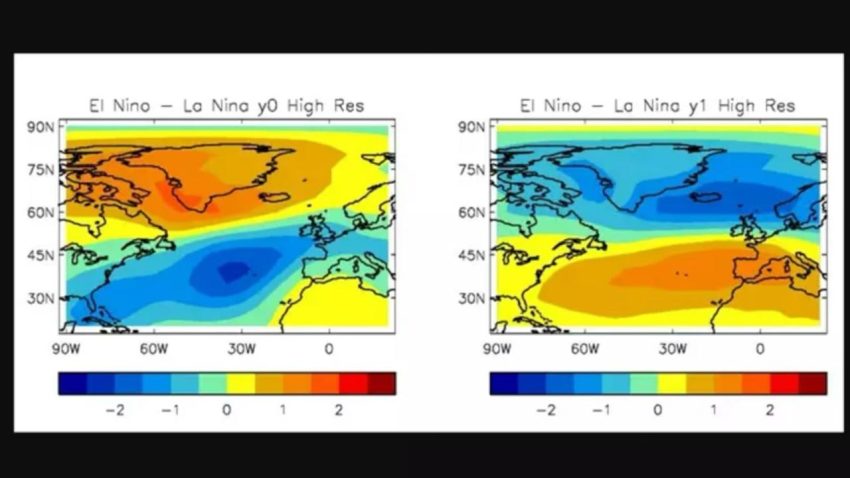 Fuera de los trópicos, los eventos de El Niño-Oscilación del Sur (ENSO) tienen un impacto adicional en los patrones climáticos del Atlántico norte, un año después del fenómeno original.