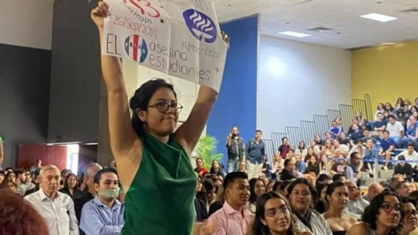 Durante la presentación de Xóchitl Gálvez en el ITESO, una estudiante levantó una cartulina que decía «El PRIAN asesina a estudiantes»; la candidata aseguró que hablará con la verdad a los padres de los 43 normalistas de Ayotzinapa.