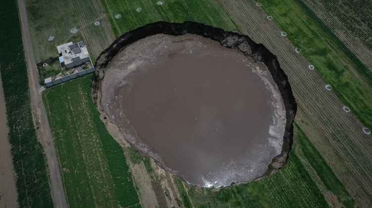 Y es que la medida que ya alcanzó comienza a preocupar a los habitantes, pues hasta se ha comparado con una cancha de fútbol profesional. A la fecha, la oquedad tiene 100 metros de diámetro y 20 metros de profundidad.