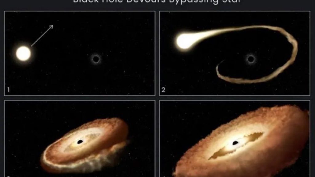 Los agujeros negros son recolectores, no cazadores. Yacen al acecho hasta que pasa una estrella desventurada. Cuando la estrella se acerca lo suficiente, el agarre gravitatorio del agujero negro lo destroza violentamente y devora sus gases mientras expulsa una intensa radiación. Esto se denomina ‘evento de interrupción de marea’.