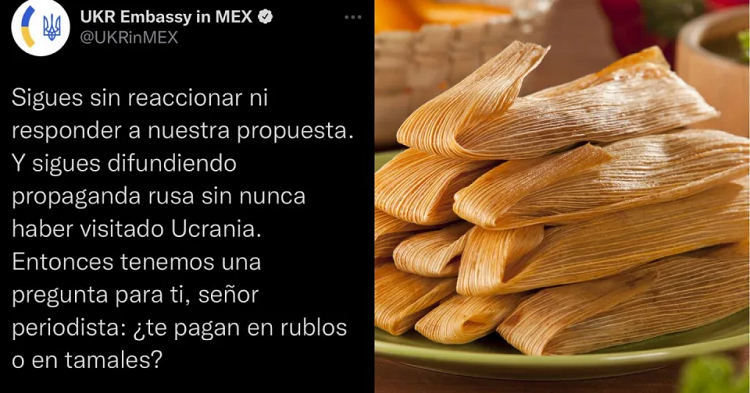 Como no les contestó rápidamente, la embajada respondió agresivamente: “Sigues sin reaccionar ni responder a nuestra propuesta. Y sigues difundiendo propaganda rusa sin nunca haber visitado Ucrania. Entonces tenemos una pregunta para ti, señor periodista: ¿te pagan en rublos o en tamales?”.