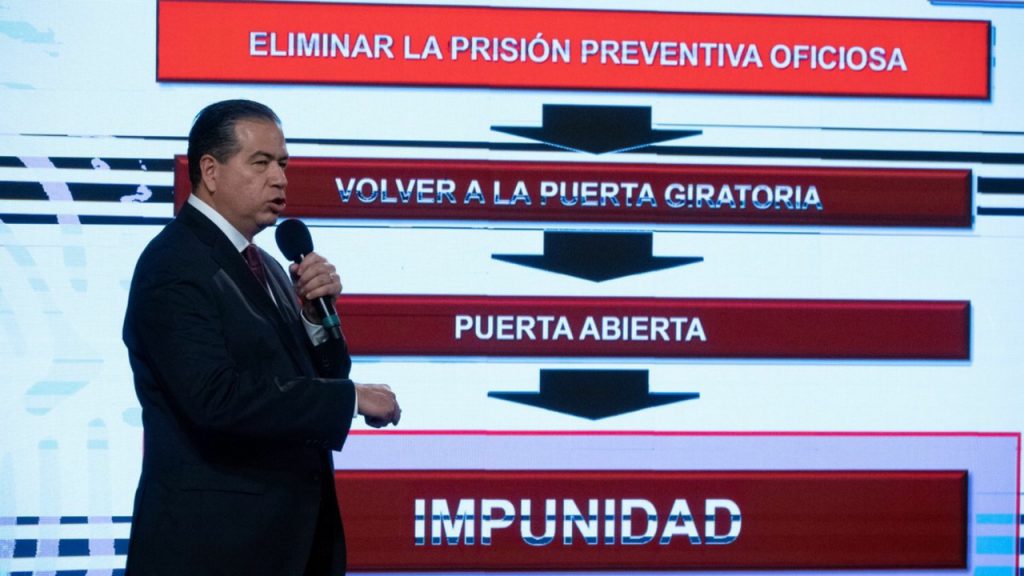 “La prisión preventiva oficiosa pretende evitar la llamada puerta giratoria donde el presunto criminal sale en libertad y vuelve a delinquir generando impacto en la sociedad y enorme sensación de impunidad. Si se elimina, como lo pretenden los proyectos que se analizarán (el lunes) en la Suprema Corte de Justicia de la Nación (SCJN), no sólo se volvería la puerta giratoria, sino sería de puerta abierta, porque 92 mil personas que hoy en México están sujetas a esta medida por delitos graves: secuestradores, narcotraficantes, feminicidas y delincuentes cuello blando, podrían solicitar mediante amparos ser excarcelados, con lo que habría una gran impunidad.”, alertó el funcionario.