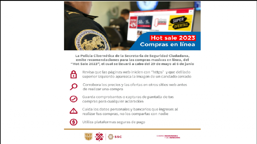 Ciudad de México. Ante el Hot Sale 2023, la policía cibernética de la Secretaría de Seguridad Ciudadana hizo una serie de recomendaciones a quienes planean adquirir bienes o servicios y no ser víctimas de fraudes al acceder a páginas falsas debido al parecido de las oficiales o porque tenían el nombre de alguna tienda reconocida.