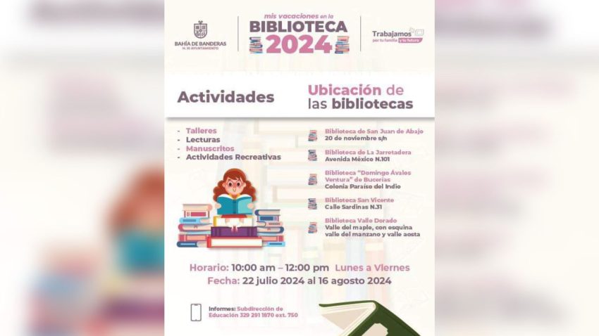 Bahía de Banderas Nay., 24 de julio de 2024.- Las bibliotecas públicas de Bahía de Banderas estarán abiertas estas vacaciones con una serie de actividades para toda la familia. Del 22 de julio al 16 de agosto, de 10:00 de la mañana a 12:00 de la tarde, grandes y chicos podrán acudir a las bibliotecas municipales para sumarse a los distintos talleres.