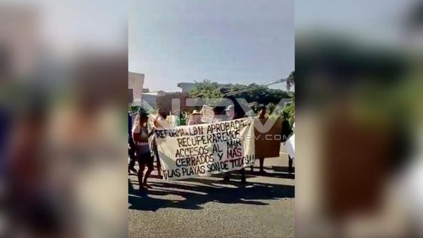 En la manifestación realizada el día de hoy, en una de las mantas se observa la siguiente leyenda, “Reforma a ley aprobada recuperaremos accesos al mar cerrados y más las playas son de todos”.
