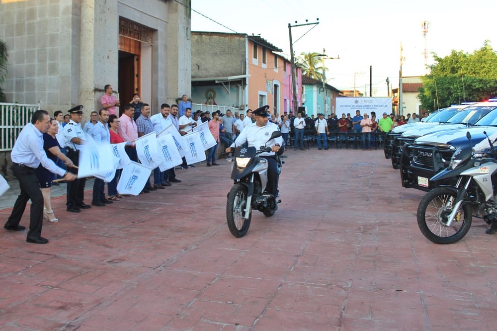 Así lo expresó el policía municipal Jorge Matías García, durante el evento en el cual, el presidente municipal, doctor Jaime Cuevas Tello, entregó a la Dirección de Seguridad Pública y Tránsito de Bahía de Banderas, 4 patrullas RAM doble cabina totalmente equipadas, 2 moto patrullas, además de armas cortas, armas largas y cartuchos, con una inversión de 3.5 millones de pesos de recursos del programa FORTASEG.