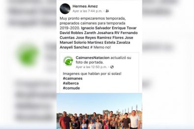 Quizá a manera de quedar bien con quien lo contrató, Hermes Amez, hizo un comentario desagradable contra este deportista menor de edad al mencionarlo en su muro de Facebook como #MemoNo! cuando compartió una fotografía de grupo del muro del equipo de natación Caimanes Natación donde este entrenador anunció la temporada de entrenamiento 2019/2020.