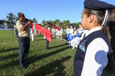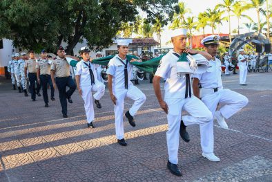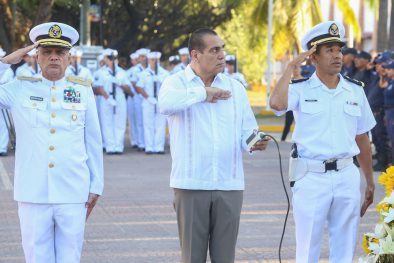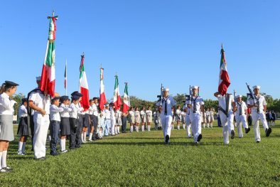 Posteriormente, el presidente municipal, junto a los mandos navales y militares, llevó a cabo el abanderamiento de 19 escoltas de preescolar (5), primaria (7), secundaria (7) y telesecundaria (1), quienes rindieron protesta de honrarla y defenderla con lealtad y constancia.