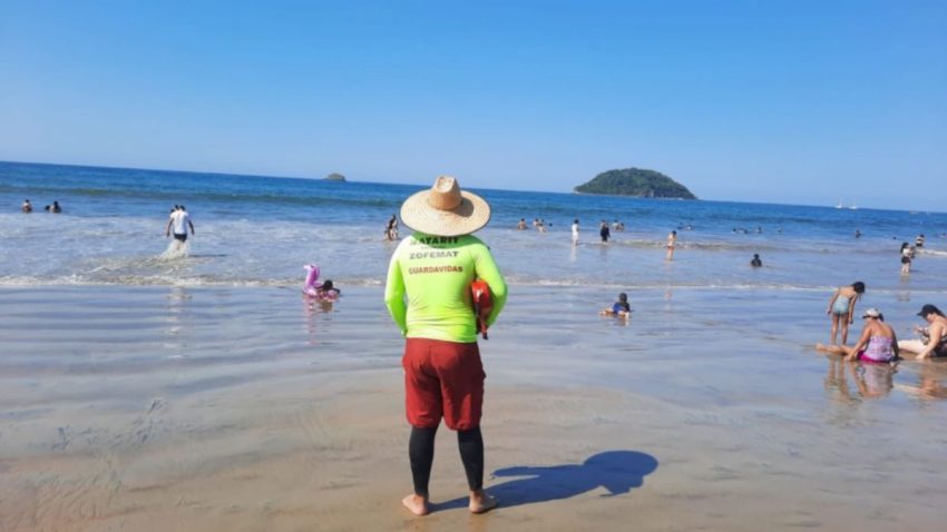 Tepic, Nayarit; 13 de noviembre de 2021.-Guardavidas del Estado, ponen a salvo a dos personas que se encontraban con dificultades para salir del mar, esto la playa Bahía de Matanchen, del municipio de San Blas.