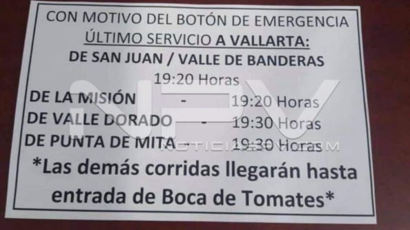 Mientras que en el municipio de Bahía de Banderas, dieron a conocer que el último servicio de San Juan de Abajo y Valle de Banderas, serán a las 19:20 horas.