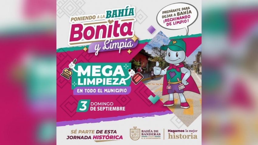 Poniendo a la Bahía Bonita y Limpia es el lema de la Mega Limpieza que se llevará a cabo este domingo 3 de septiembre, en todo el municipio de Bahía de Banderas.