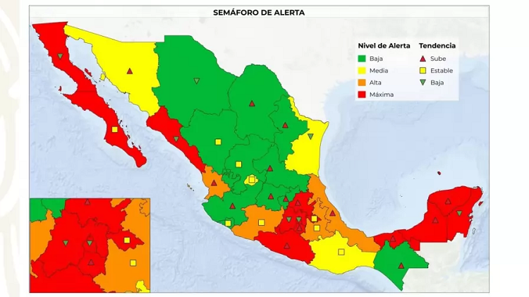 “Por ejemplo, la Ciudad de México se encuentra en territorio rojo y un triángulo rojo hacia arriba, que indica que todavía está en fase de ascenso y además está en un punto muy intenso de transmisión. Oaxaca tiene una transmisión baja y tiene una estabilidad en la velocidad de cambio. Mientras que Quintana Roo, donde está Cancún, un centro turístico importante, vemos que aunque aún existe intensidad de casos ya se muestra una tendencia a la baja, se espera que en los próximos días o semanas vayamos a tener una reducción de la carga de enfermedad en este estado”, expuso.