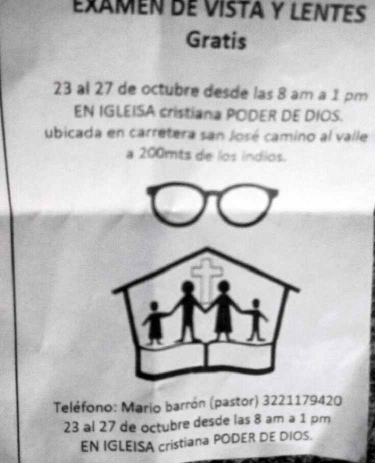 *Desde hace 5 años, especialistas de los ojos de EU, ofrecen servicio social de manera gratuita a través de la Iglesia Cristiana Poder de Dios. Serán los días 23 al 27 de octubre 2017, de 8 de la mañana a la una de la tarde. Son oftalmólogos que también detectan y diagnostican enfermedades. Adultos de la tercera edad y niños, se les invita de manera especial, pero el servicio es para quien asista