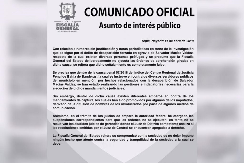Derivado de la publicación periodística de la procedencia del amparo indirecto 335/2019 interpuesto por Álvaro Macías, el 1 de abril 2019 ante el Juzgado Primero de Distrito en Materia Penal por incumplimiento de ejecutar órdenes de aprehensión por parte del Fiscal General de Nayarit, del Director General de Investigación Ministerial y el director General de la Policía Nayarit, con relación a la causa penal 57/2018 por la comisión del delito de Desaparición Forzada de Persona en agravio de Salvador Macías Valdez, desaparecido de la cárcel preventiva de Bahía de Banderas, en hechos ocurridos los días 29 y 30 de junio 2018, la Fiscalía General de Nayarit, emitió un comunicado oficial publicado en su muro del Facebook este 11 de abril 2019, donde señala que lo dicho en esa publicación periodística es falso, además, temerariamente afirma que, los involucrados en dicho delito se ampararon porque “Medios de Comunicación” dieron a conocer sus nombres, lo cual también es falso.