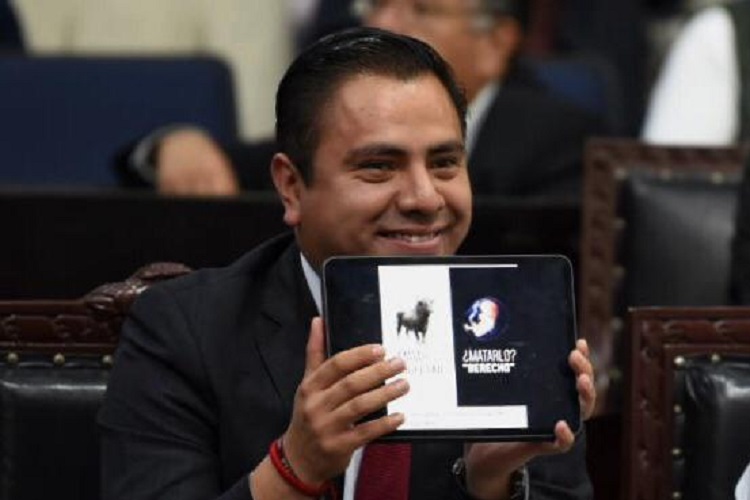 En la tribuna, el legislador mostró su tableta electrónica con un meme formado por dos imágenes: en la primera presenta un toro y la interrogante: ¿Matarlo? Crueldad. En la segunda se muestra un feto y la frase: ¿Matarlo? Derechos. Luego una reflexión: Las absurdas incongruencias del ser humano.